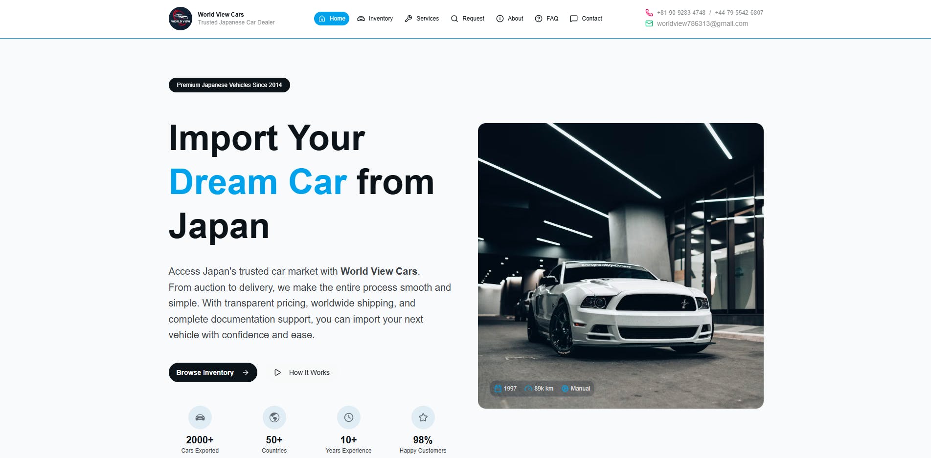 WorldView Car is a dedicated platform that facilitates the import of high-quality vehicles directly from Japan, catering to individual buyers and dealers alike. Through exclusive access to Japanese auctions and dealerships, it ensures competitive pricing and thorough vehicle inspections. The service covers the entire import journey, including sourcing, transport arrangements, customs clearance, and delivery to your preferred port. Additionally, WorldView Car offers related services such as vehicle transportation and full documentation support. Designed to simplify the import process, it provides expert guidance and comprehensive logistics to ensure a smooth, transparent experience for customers.